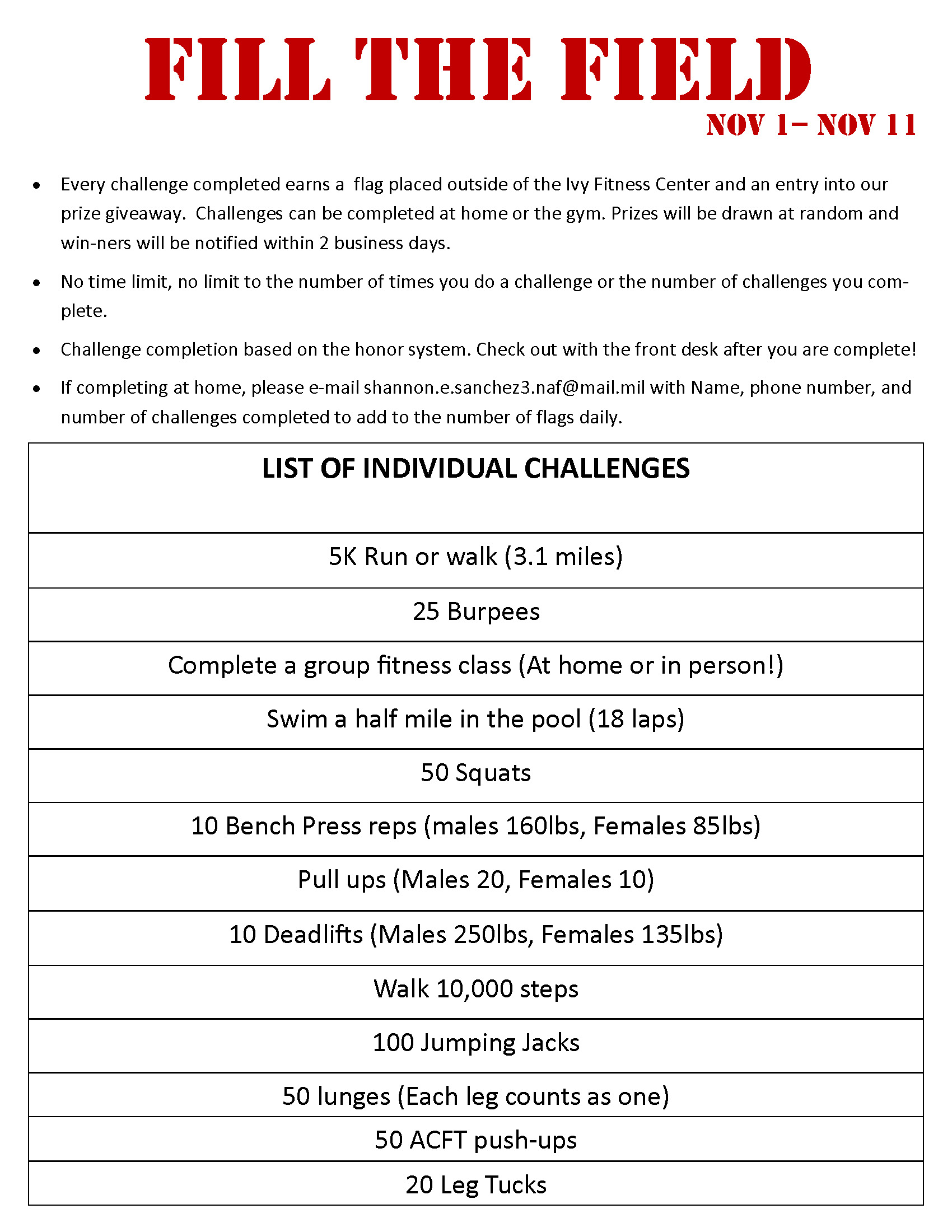 Fill the Field Challenge Week runs November 1-11 in honor of Veteran’s Day.