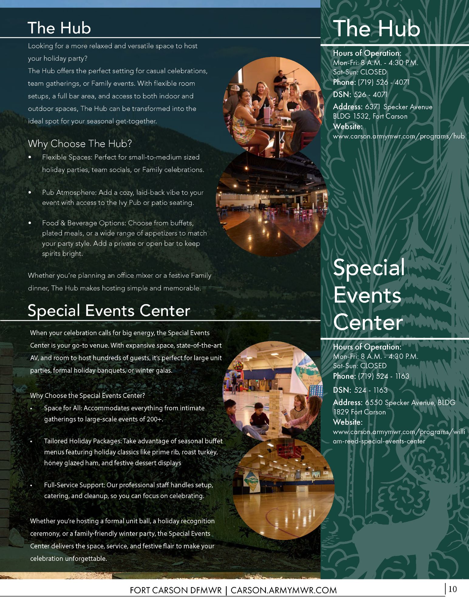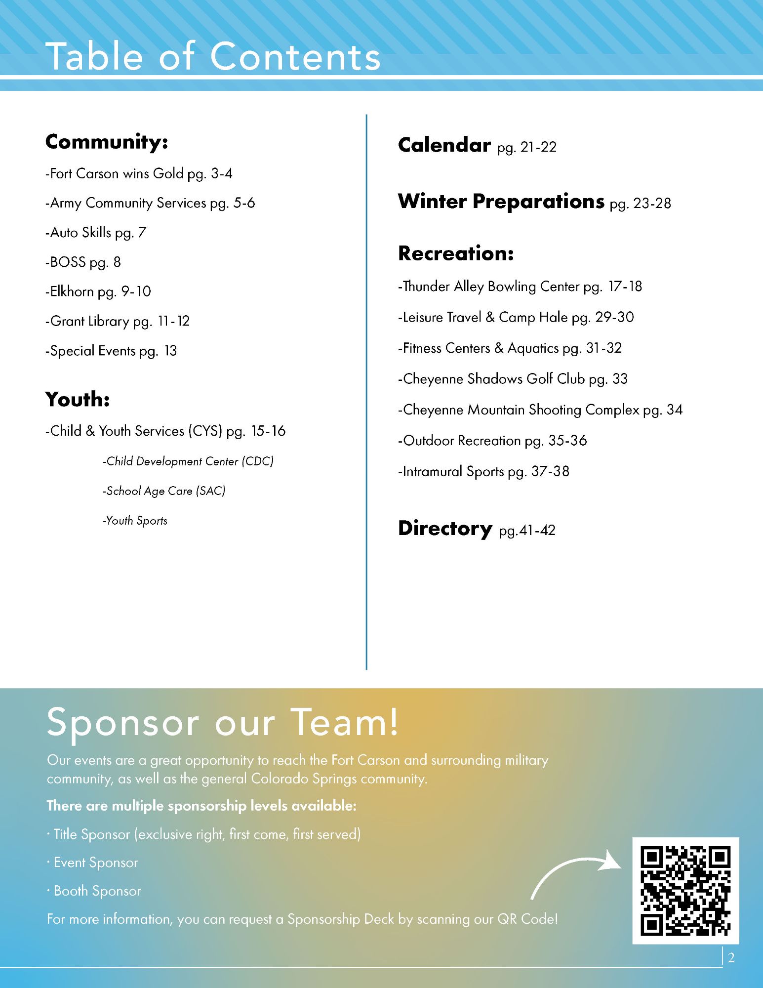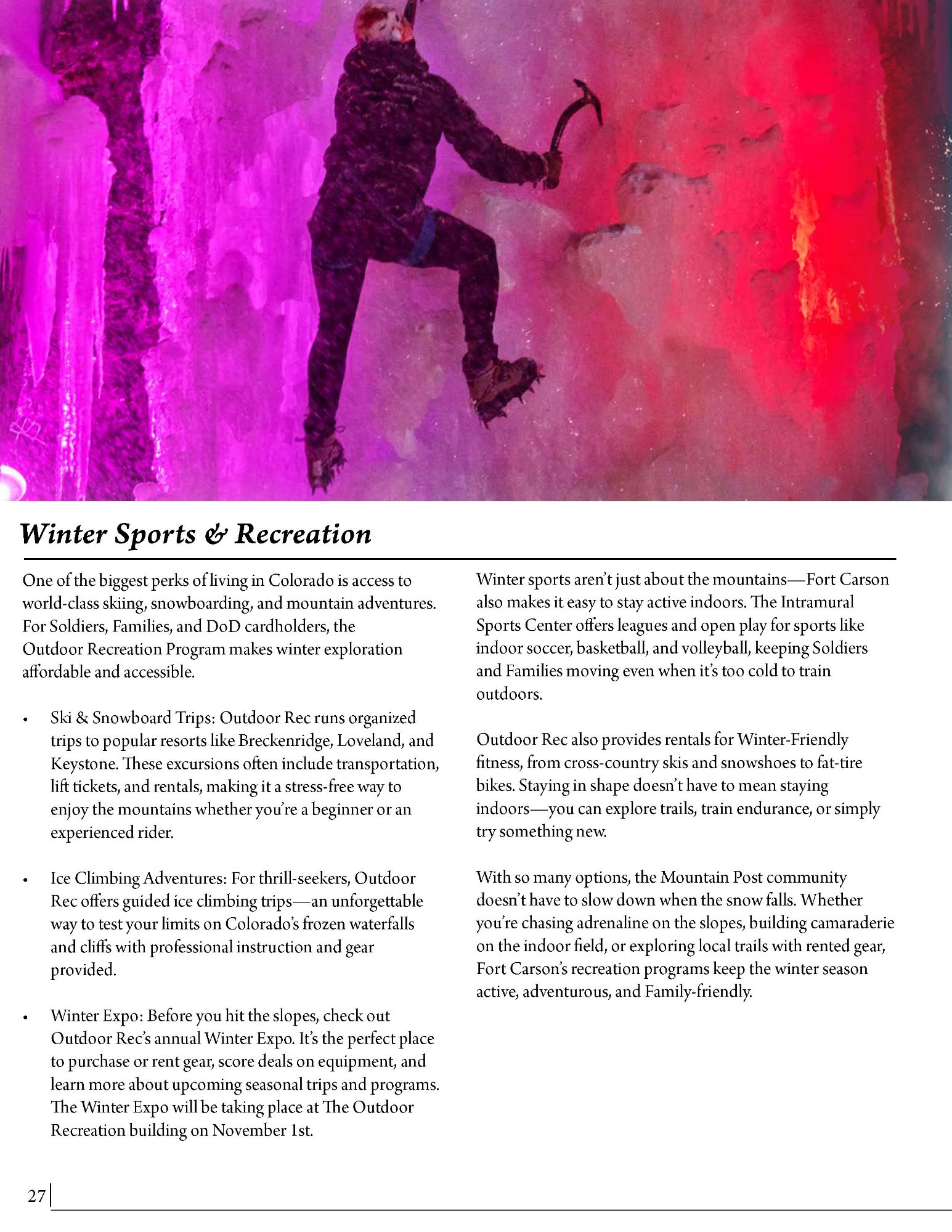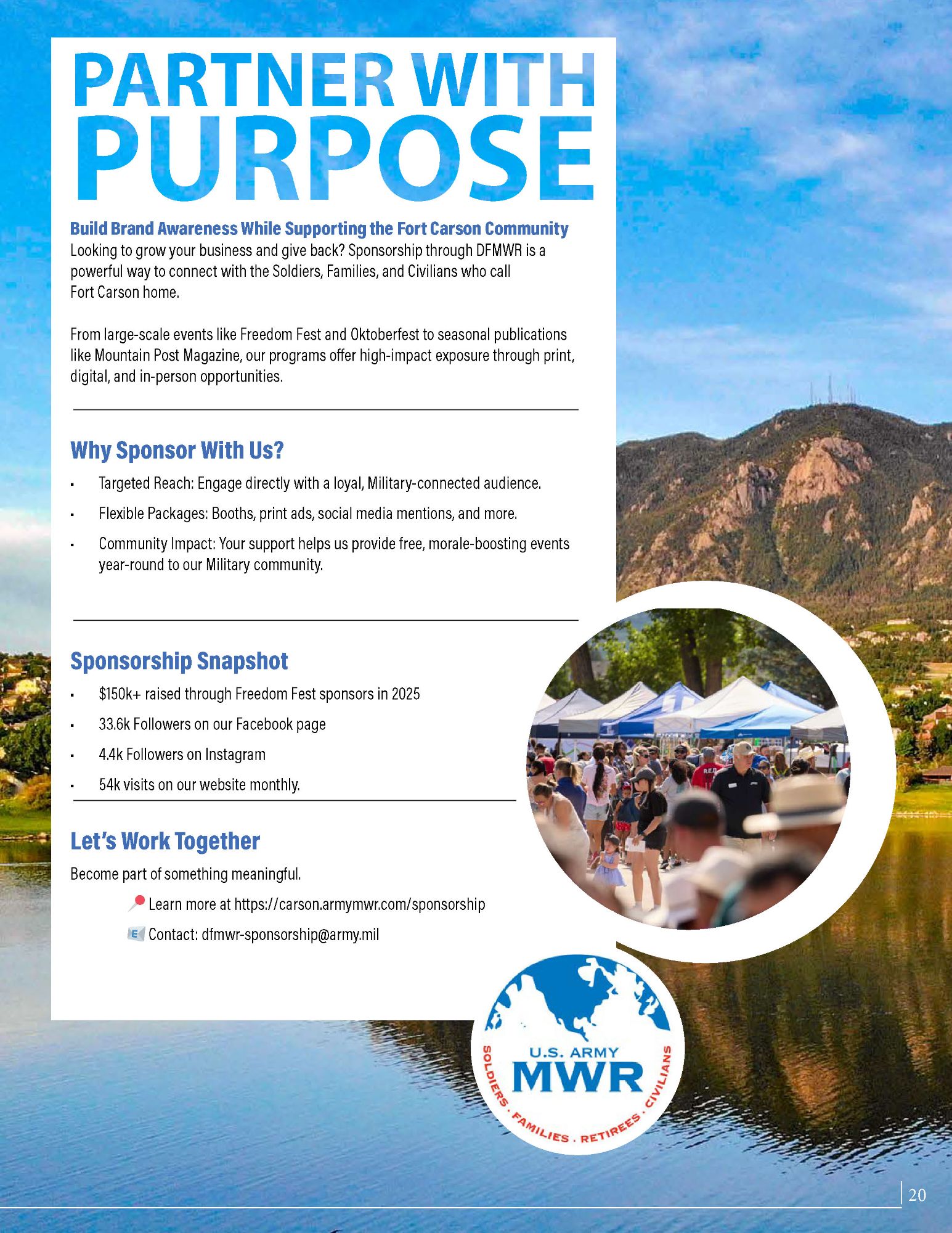 Updated quarterly, Mountain Post Magazine features a comprehensive summary of all community programs, events, & leisure opportunities Fort Carson MWR has to offer – including a complete directory of facilities and a quarterly calendar of upcoming events!
