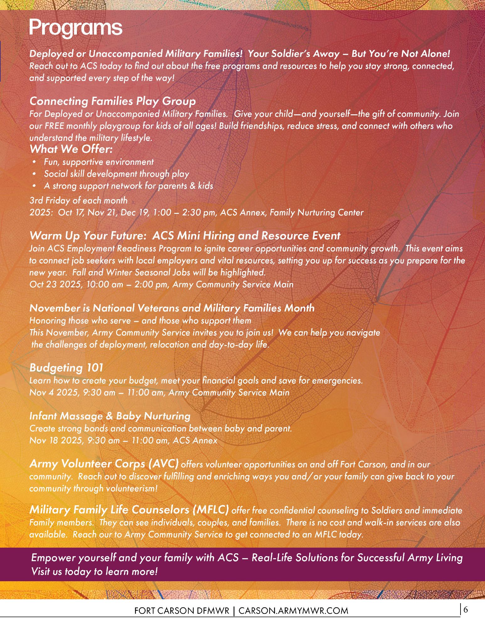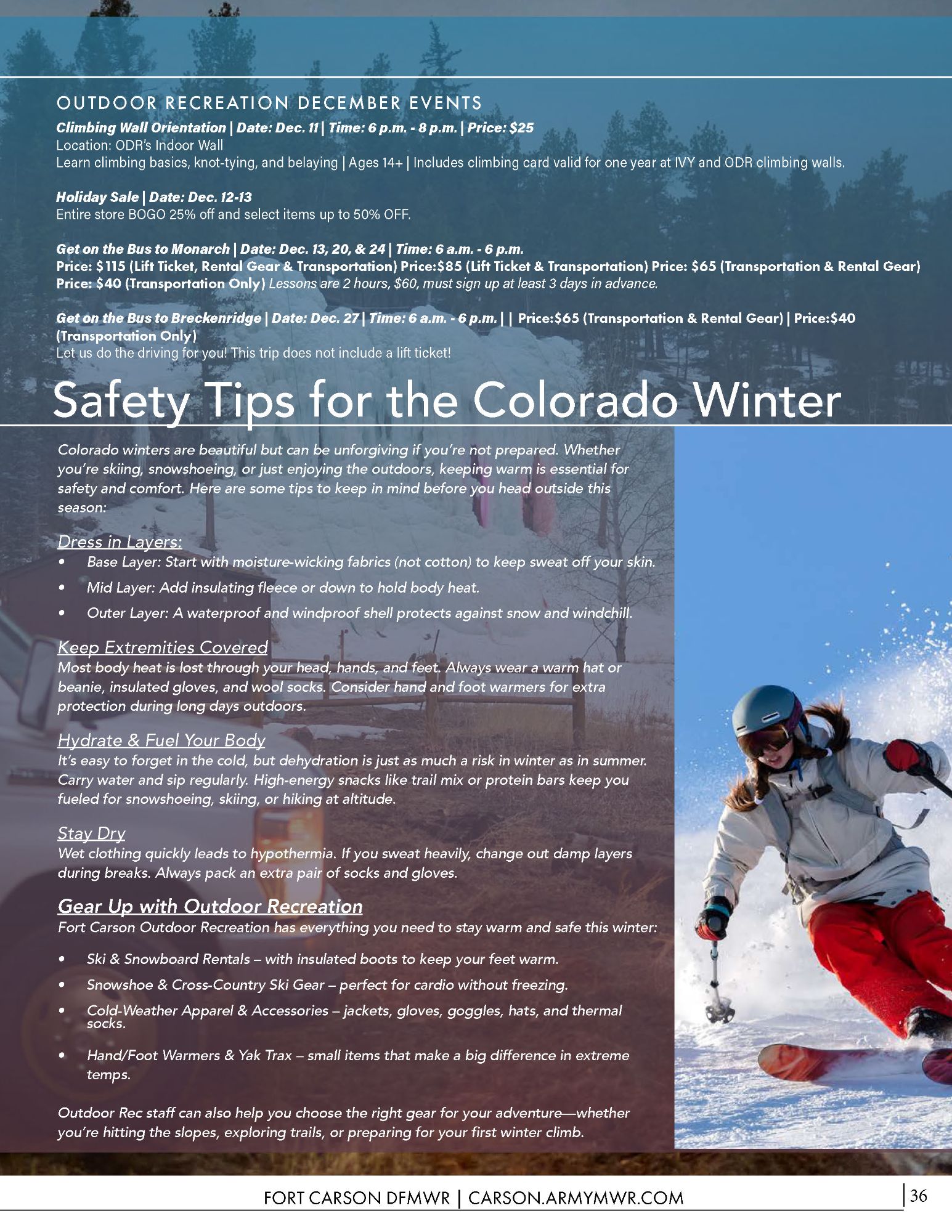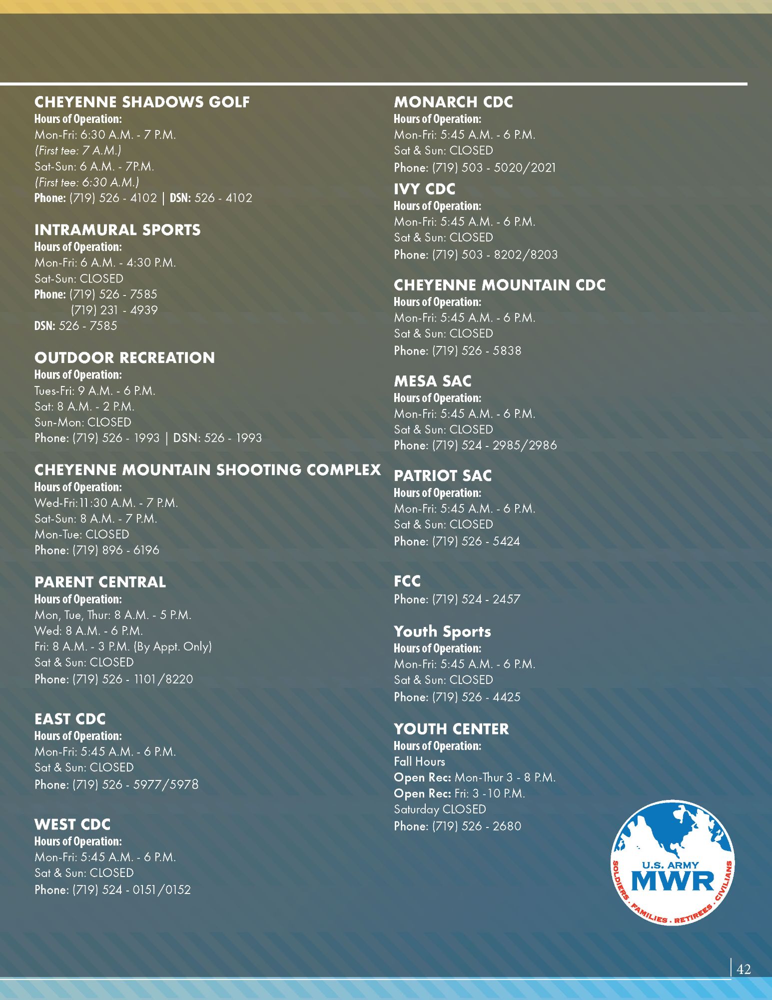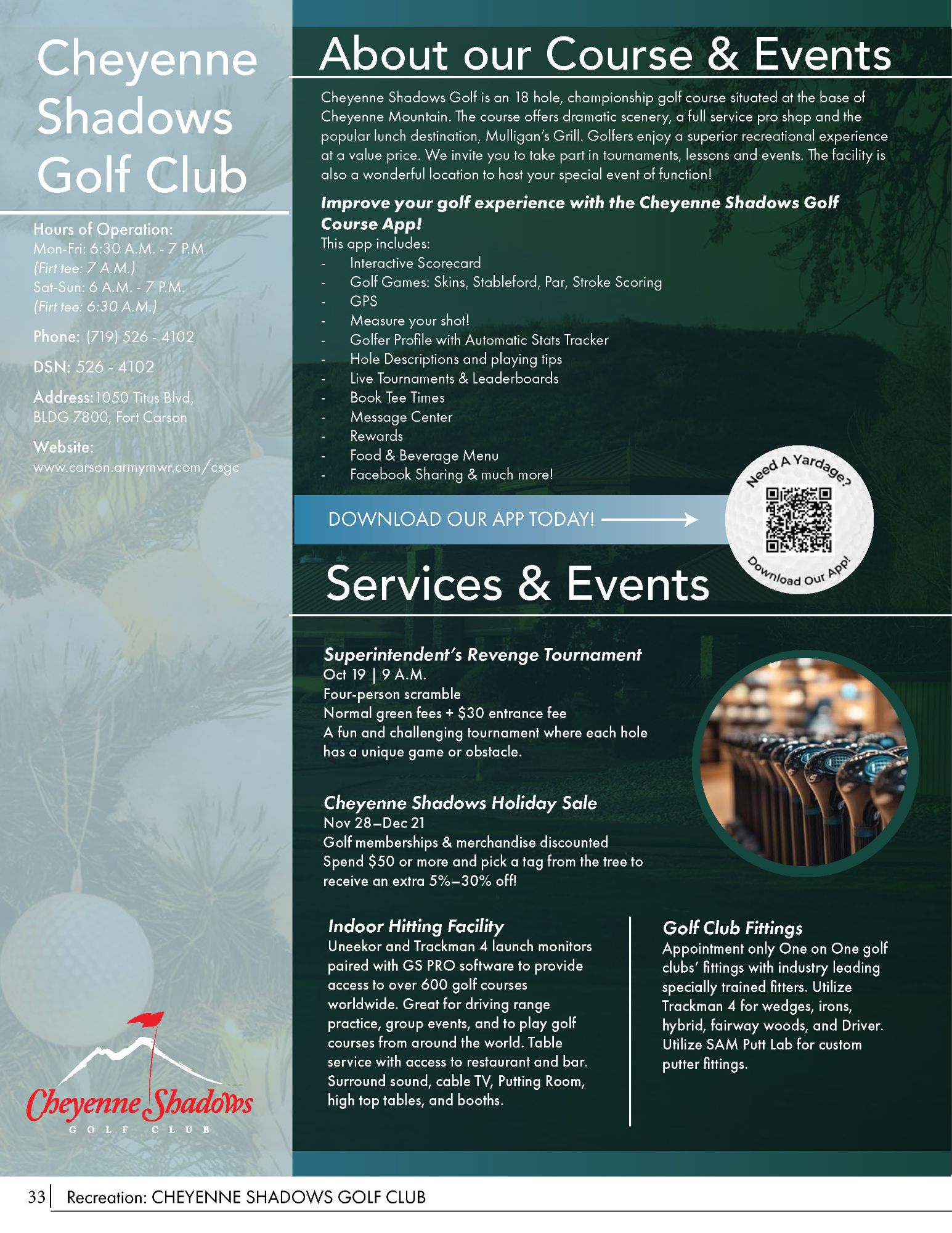 Updated quarterly, Mountain Post Magazine features a comprehensive summary of all community programs, events, & leisure opportunities Fort Carson MWR has to offer – including a complete directory of facilities and a quarterly calendar of upcoming events!