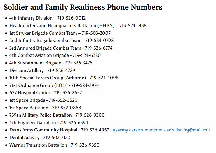 Soldier and Family Readiness Group (SFRG) SFRG is an OFFICIAL organization to help ensure military Families are mentored, educated and trained in Soldier and Family deployment readiness. SFRGs help with: SFRG is an integral part of keeping the deploying unit and Family members together. Visit Carson.army.mil for additional Fort Carson SFRG resources. Click here for a list of Fort Carson SFRG phone numbers. |