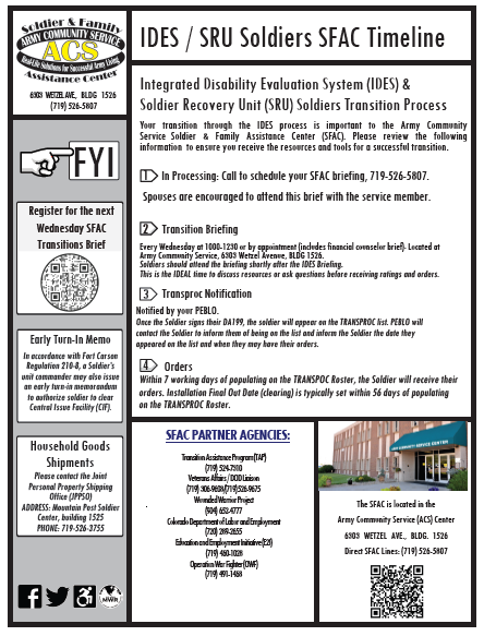 This brief is for SRU and IDES Soldiers that are transitioning out of the military. The brief covers military benefits and services transitioning Soldiers can utilize and provides an orientation to the SFAC Program. Open to all SRU, Integrated Disability Evaluation System (IDES) Soldiers and their family members.
