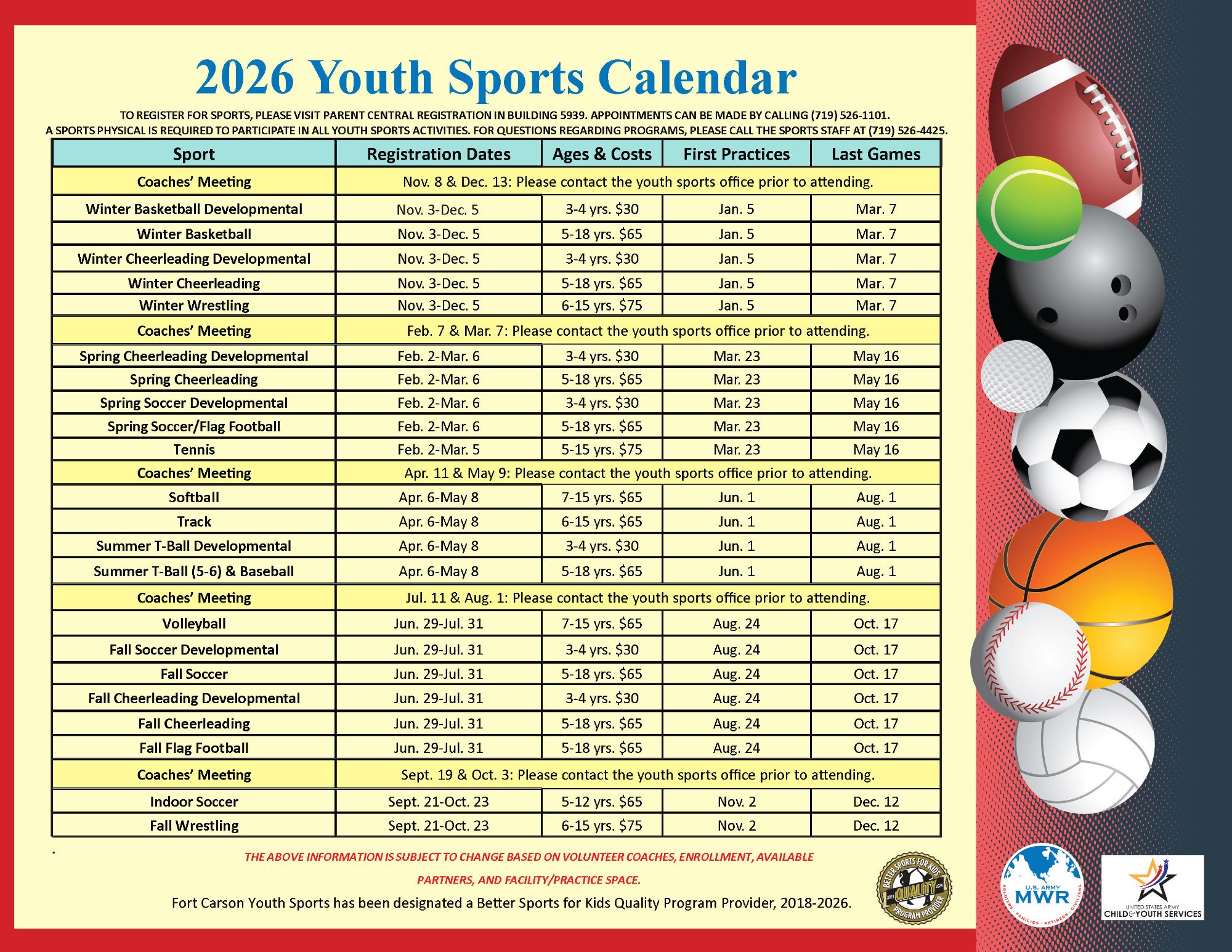 Sports are a great place for young athletes to learn values like teamwork, fair play, and good sportsmanship. Fort Carson Youth Sports strives to provide youth and coaches of all backgrounds and abilities with an environment that develops character, cultivates confidence, and helps them obtain the skills needed to be the best versions of themselves within and beyond sports.